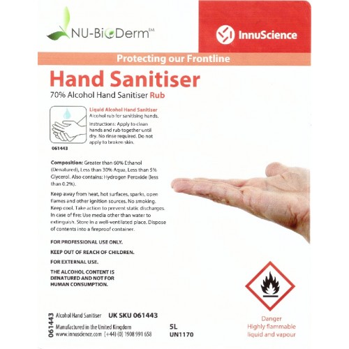 The COVID-19 pandemic has meant that essential hand sanitising products and raw materials have been in short supply. We have secured a small number of 5L bottles of a new product by the reputable InnuScience. This literally has only just come out (we even had to email them to confirm the product was genuine, since it isn't featured on their website) but is already sold out by the distributor. To help, we have carefully filled smaller containers for easy mailing and carrying (we often shook the main container before refills to ensure even composition). We mainly chose 30ml containers because this is the exact amount dispensed each time the pump is fully depressed.